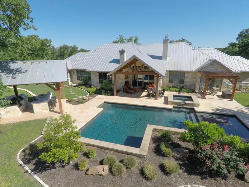 Texas Hill Country elegance describes this exquisite custom built home sitting on a scenic and secluded 46 ac. in NW Llano County. Complete with a gorgeous gunite pool with hot tub, Cabana and outdoor living area, this beautiful home is nestled in a park-like setting among gorgeous live oaks and post oaks. Larger ranches and a few smaller neighbors surround the property, which is located at the end of a county and private road, giving you complete privacy. This fabulous home was built in 2010 and offers over 3900 sf of unsurpassed quality and design which includes 4 bedrooms, 4.5 bathrooms, office, formal dining room, living room, game room, mudroom, utility room and a chefs kitchen complete with a double walk-in pantry, separate appliance closet, sonic ice maker, pot filler above the range, warming drawer, Knotty Alder custom cabinets, granite and mesquite countertops, coffee/wet bar...