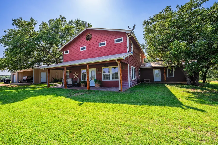 This 2-story ranch-style home sits on 15.189 acres of gently sloping, nearly rock-free land. Perched on a hill, the home offers breathtaking vistas of Sandstone, Sharp, and Riley Mountains, along with views of the Llano cityscape.The house features 4 bedrooms and 2 full bathrooms. The cozy living room boasts 16-foot vaulted ceilings, a stunning rock fireplace, and a cedar-railed stairway. The open-concept kitchen and dining area, with a breakfast bar to enjoy the outside views through the windows, is perfect for entertaining or enjoying peaceful meals. The master bedroom includes a large walk-in closet with separate his and her sections. The master bathroom is equipped with a glass shower and ample counter space. A versatile 360 sq. ft. office, accessible from the master bedroom or an exterior entrance, features a large closet and could be converted into a game room or mother-in-law suite (bathroom addition needed). Upstairs, you will find three additional bedrooms, each with either walk-in or large reach-in closets. Additional amenities include a mudroom with washer and dryer access, carport with 12x24 workshop, 8-stall barn, 60GPM well, fenced back yard with dog yard and house.