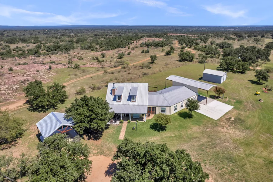 Picture Perfect Home on 74 +/- acres near Llano, Texas. Everything you could need is perfectly in place! The main house features a Foodies dream kitchen with Thermador 48 gas range with 6 burners, steam oven, warming drawer, grill and more, Thermador dishwasher, huge island and beautiful cabinetry. Kitchen is open to great room where you will dine with ease and enjoy living area with fireplace- all with spectacular views and abundant natural light. An overhead loft features seating area over great room and leads to second bedroom and bathroom. Downstairs the master bed and bathroom feature stunning views and a well-planned walk-in closet. A screened in breezeway separates the main house from guest quarters which has full bathroom and room for two beds. There is ample and well placed storage throughout home. The screened porch wraps around and leads to an outdoor seating area with firepit...