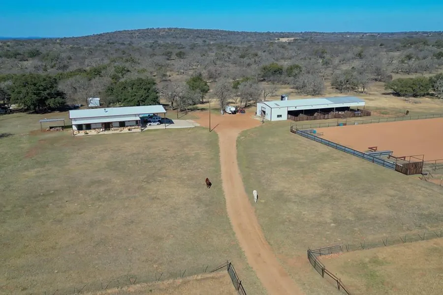 AMAZING HORSE PROPERTY!-Located 6.5 miles north of Llano, this scenic 28 Ac Ranch offers a beautiful 3/3 Metal and Rock Barndominium (2400 SF built in 2018) with custom masonry interior/exterior accents, hickory cabinets, 8 ft doors, freestanding see through fireplace, new HVAC, water softener system & lots of other custom finishes throughout. A 120X40 Metal Barn has 9 oversized pipe stalls, hay & feed storage (on slab) plus ,2-20X24 rooms with mini-splits for office, tack, gym or craft areas. There's also a 220X140 pipe arena with cattle return lane & 2 chute lead ups with lights from the barn allowing for night riding. Chicken Pen,3 sheds, 4 paddocks w/water supply to all 2 wells, 2 elec. Meters, an RV hookup, & beautiful coastal field, yielding approx. 65 to 85 round bales per year, complete the rest of the improvements...