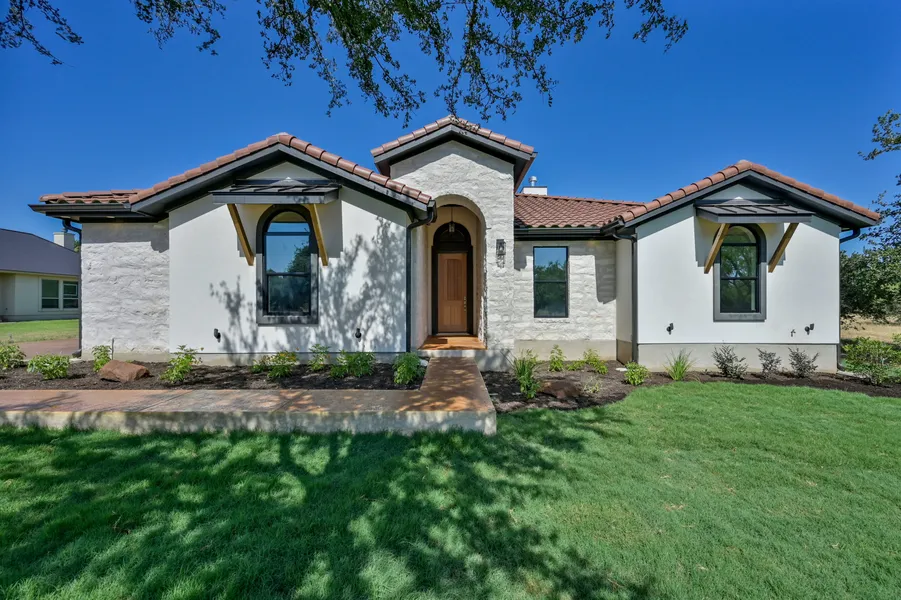 Santa Barbara meets Hill Country with this new home offered by McKay Vassaur Custom Builders. Situated nicely along the 15th hole of Apple Rock Golf Course you will have wonderful views of the course and Texas Hill Country. The open floorplan flows perfectly from inside to out. Tri-fold sliding glass doors open from the living area to the spacious covered back patio. Enjoy tongue and groove ceilings on the back patio along with outdoor grill as you watch golfers or the resident deer frolicking. Back inside, the living area includes high ceilings accented with full wood beams. The floor to ceiling stone fireplace includes a custom mantle and becomes the focal point for family living and/or entertainment. The primary bedroom sets privately toward the back of the home providing great views of the course and live oak trees. A large tub compliments a beautiful walk-in shower. The secondary bedrooms are located on the opposite side of the home with easy access to another bathroom. The home is rounded out with a dedicated office and laundry room with sink and cabinetry installed. Horseshoe Bay provides access to some of the best golf courses in Texas and the constant level Lake LBJ. For anyone looking to enjoy the outdoors but have the convenience of Austin being less than an hour away, this is your place to call home!