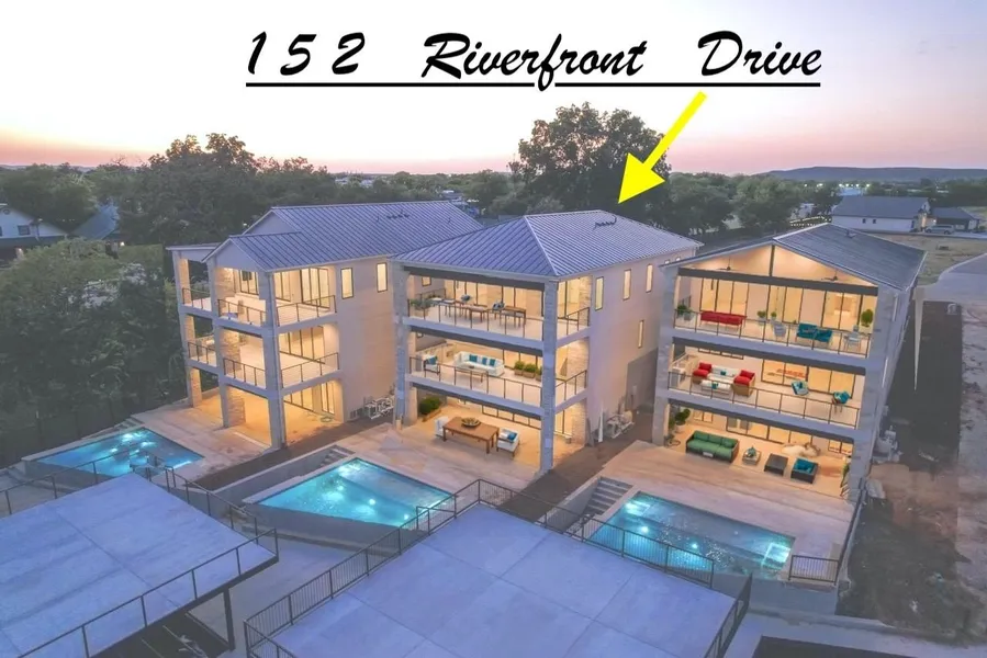 152 RIVERFRONT DRIVE - One of 3 Luxury Waterfront Villas just completed on Lake LBJ. 152 RIVERFRONT DRIVE is the perfect place for family and friends to enjoy relaxing afternoons on your Lakeside veranda overlooking Lake LBJ and the storied & pristine "Moss Family Ranch". Located at the private & gated 2 Rivers Landing subdivision with its convenient "close in" Kingsland location, 5 minutes to HEB, & within site of Lake LBJ's premier fun spots, WakePoint, Boat Town & Liberty Island. Inside 152 RIVERFRONT DRIVE there's enough room for the whole family and friends with over 4500 ft.2 of living space featuring 7 bedrooms, (including bunk rooms) and 7 1/2 baths. The Swimming Pool Level features a 2nd living area/ game room with big sliding doors that open to a covered porch and outdoor kitchen. There's over 3000 ft.2 of outdoor living space, 2 covered patios, poolside patio, + a party deck a...
