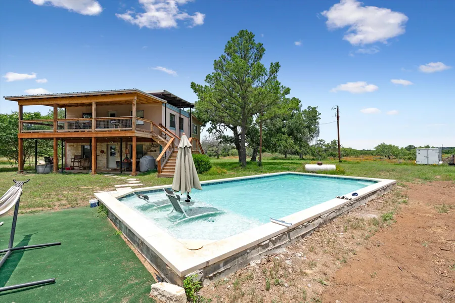 What a unique opportunity on this 5 acre tract of land in northwestern Llano County. The property is deep fertile soils with huge oak and mesquite trees throughout. There is an excellent water well, electricity, septic, and metal barn with a workshop attached. The house is a two story concrete block 3 bd / 2 ba home with huge cedar porches and balcony to sit outside and enjoy the countryside. There have been numerous remodel improvements to the house, but some of those projects are still being completed. The house is being sold as is, with the new owner having the ability to complete the remodel and make the finishing touches exactly how they like. However, what sets this property apart from most is the in-ground swimming pool that alone cost close to $100,000 to install. The new owners can truly enjoy the country life while relaxing in their custom swimming pool. This property truly has...