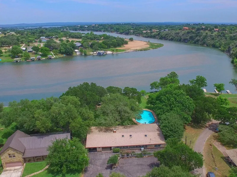 This one of a kind Lake LBJ home is the quintessential lake house boasting 88 feet of North facing open water with towering trees and a rolling lush lawn down to the waters edge. The home features an open living area with handsome tongue and groove wood clad walls, beamed ceilings, fireplace and wall to wall windows. The galley style kitchen offers a full complement of upgraded appliances, granite counters, custom cabinetry, built-in desk and a cozy breakfast bar. The lakeside master suite has a view that you are going to want to wake up to every morning; green grass, panoramic lake views, and the occasional swan. The updated master bath has a whirlpool tub/shower with rain head, large vanity and walk in closet. A unique secondary bedroom, currently being used as a dining room, is an adaptable flex space with large bi-fold and pocket doors that can be opened up to the main living area to be used as a second living and it also has its own half bath. There is additional living space behind the kitchen that is an ideal bunk/craft room, complete with a renovated full bath. This property is all about outdoor living offering a large covered rear patio on one side and a large screened in back porch on the other. Just off the screened in porch is the guest quarters complete with a second full kitchen and private bath that doubles as the pool bath. The water enthusiast will love this backyard paradise including the boathouse with three slips, sprinkler system, luscious landscaping, and beautiful in ground pool.