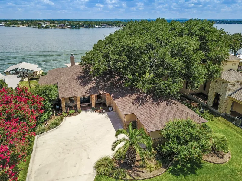 Lake LBJ gem! This newer 3/3.5 has it all: 100 feet of tremendous open-water frontage with panoramic views of Lake LBJ, two covered decks from which to enjoy the southeast breezes and watch the water activities, or sip your coffee and enjoy the sunrise over the lake. Stroll down to the boathouse and go for a leisurely boat ride or a fast-paced Jet Ski experience. The home has a large great room with beamed and vaulted ceilings, fireplace and custom cabinets with granite counter tops on the main level, along with master bedroom suite. Both have walls of glass for lake view and opening onto the upper deck with built-in grill. Also, this level has office, utility room, and oversized 3-car garage. Lower level offers completely separate living space, including 2 bedrooms overlooking the lake, large game room with another full kitchen, lots of glass for more lake views, a second covered patio and fireplace. Theres room for a pool lakeside, and the location offers some of the best water on Lake LBJ deep and clear.