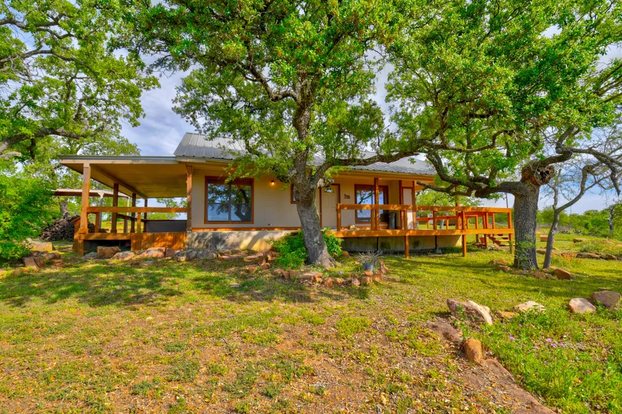 WHY RENT IN THE TEXAS HILL COUNTRY, WHEN YOU CAN OWN! - This cozy approximately 840 sf 2/1 cabin with wrap-around porches on 3 sides, is nestled among huge live oak and post oak trees and looks out over the beautiful hill country and neat granite outcrops. It features a wood burning Fireplace, vaulted ceilings, central HVAC, and a stackable washer and dryer in the bathroom. There's also a detached building with electricity for extra storage, or put in a bathroom and finish it out for a cute guest house! Double carports are by the house and the storage building, along with a fenced pen area with a pole barn. The property is Ag exempt, it's fenced on 3 sides, and it has new well w/storage tank. The property is being surveyed out to at least 5 ac, with the east side being unfenced and right above a seasonal creek. You're near the end of a dead end road, so you're far away from any highway noise. You're within 20 minutes of the Llano River and Lake Buchanan and close to lots of other scenic adventures in our beautiful Hill Country! Some reasonable restrictions will apply. Make an appointment to see this charming place today, as it won't last long! Co-listed with Judy Schuessler, Agent with Virdell Real Estate in Llano.