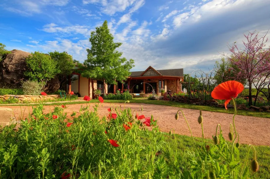 Idyllic Texas Hill Country home on 10 acres. This one-of-a-kind property features a large spring fed pond, long distance hill country views and massive granite rock formations. This 3/2 custom stone home was designed to fit into its beautiful native Texas landscape while taking advantage of gorgeous views all around. Built among huge boulders and with extensive stone work and landscaping this property is strikingly scenic. The home has numerous doors and covered porches to give it an open to the outside feel. The open kitchen/dining concept features quartz countertops, Jenn-Air cook top, wall oven and custom wood cabinetry. There's a large family room with fireplace, bar, and doors that open onto a wrap-around porch and courtyard. The master has bamboo floors, tall ceilings and french doors that open onto a balcony with a view of the water. Out back is a pergola, outdoor fire place, rais...