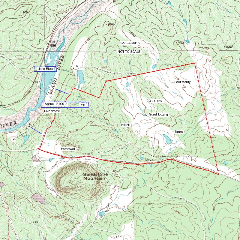 THUNDERHILL HIGH FENCE RANCH. East of Llano an exclusive highly improved, high fenced game ranch with approximately 2,900+- feet of beautiful Llano River frontage will fulfilled your every dream. The main river home is privately situated among large live oaks on the banks of the highly acclaimed Llano River and is an exquisite contemporary custom built three bedroom and four bath beauty. The open high cathedral ceiling in the living with attached lanai take every advantage of the river and hill country views. Large windows and French door open onto a full length open railed patio and adjoining is a spacious covered patio for entertaining with full outdoor kitchen, dining area, and 12 foot salt water hot tub. There is a large covered patio for parking with concrete drive and a good access road to the Llano River. Other fine features of this luxurious light filled home: a gas/log fire-place, zoned central heat and air, beautifully stained concrete floors, open kitchen with custom built cabinets, electric range, electric oven and granite countertops, baths have tiled showers and granite countertop, utility room with tiled shower bath and exterior doorway. The exterior of the home is stucco with a standing seam metal roof. Front grounds are landscaped with native plants and remainder of 47 acre river country is heavily wooded with good cover for; deer, turkey and other hill country wildlife. Upper river frontage is most unique, with statueques granite uplifts, granite out in the river, a large sand bar, deep water, shallow access water and a high scenic overlook up and down the the Llano River. The lower river acres has gently rolling sandy loam soils with small granite uplifts and good river access.