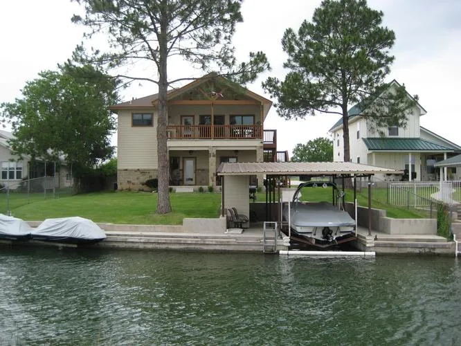 Immaculate 3BR- 3 1/2 bath Lake LBJ home at mouth of channel to open water. Great views of the open water from living and kitchen areas. This home was built in 2007 and has a beautiful wrought iron gate at entry from street and well-manicured lawn. Nice boathouse with storage area and 2 jet ski lifts. There are two patios, one with a built-in grill and cooking area. Breath-takiing views of the open water on each patio. The inside features granite countertops throughout, walk-in shower in master and many more great features. The beautiful lawn is maintained with a sprinkler system watering from lake.