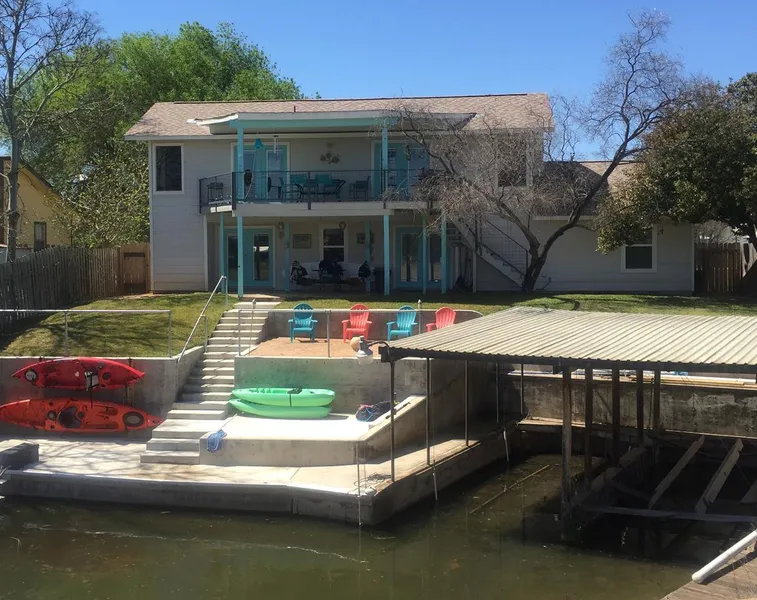 Bright and whimsical updates, including new kitchen in this waterfront Sunrise Beach home that's the perfect lock-and-leave retreat or full-time home. Kitchen has huge breakfast bar and countertops made of quartz, colorful back splash and stainless appliances. On a channel with great views to open water from downstairs patio or second-story deck. One-stall boat dock with electric lift. And, control your dockside boom from an app on your phone! Two large bedrooms, plus bonus room, laundry room and small garage storage area. The upstairs living and dining allows you to enjoy the lake views.