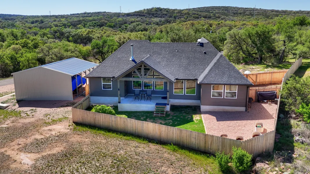 Gorgeous new construction at Inks Lake! This 3/2 - 1,883 sq ft (living space) is fresh, clean and ready to be your full-time home or hill country retreat at the lake. The home features vaulted ceilings with wood beams, beautiful concrete floors, large windows and a great floor plan. An oversized 8' entryway door reveals a large open living/dining/kitchen area that has sweeping views of the surrounding hills and Inks Lake. The kitchen has custom cabinets with quartz countertops, large island and new stainless steel appliances. The owners suite has a tray ceiling and large bathroom with his/hers closets and a gorgeous tile & glass shower. On the other side of the home are two bedrooms and a guest bath w upgraded tile work. Off the entry way is a room with double glass doors that could be used as an office or craft room. The "Texas Sized" garage is large enough for full sized vehicles and has a great additional work space & home water filtration system. Out back you'll find a large "Aspen" style porch with large wood beams and vaulted ceiling, what a great place to relax and take in the views of the lake! Wood fencing creates multiple yards for pets, garden etc. The oversized metal carport is large enough for most boats and RV's. Whole house generator w propane tank installed and ready. Access to Inks Lake is just down the street at the property owners park with boat ramp and day dock. Here's your chance to step into a picture perfect dream home in the Texas Hill Country. Approx. 15 mins W. of Burnet, TX. OR Approx 1 hr 20 mins NW of Austin and San Antonio.