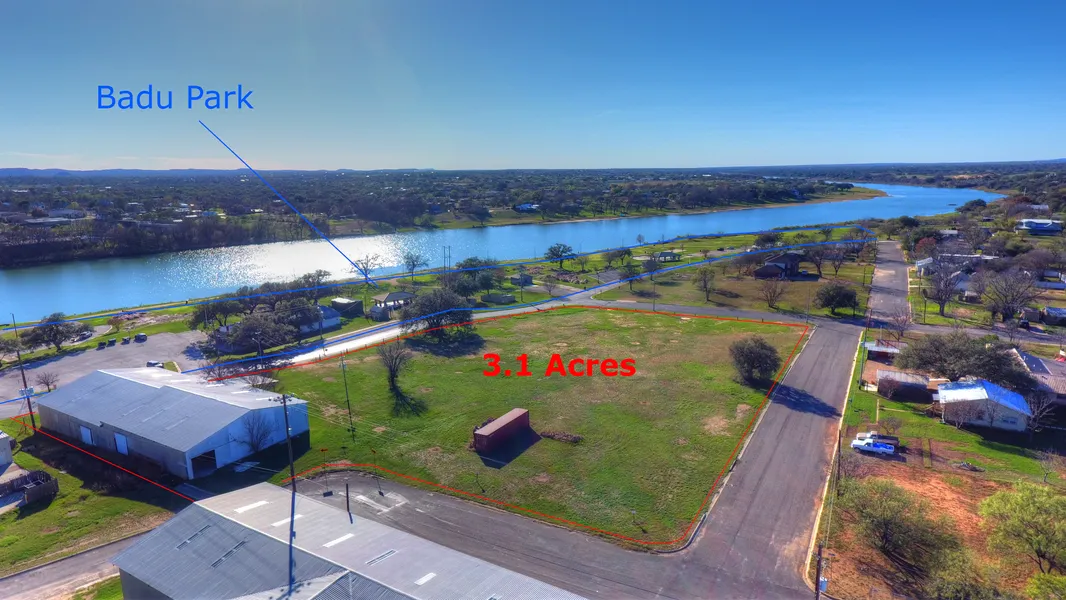 3.1 acres directly across the street from Badu Park in the City of Llano. Big waterfront views, paved city streets on 3 sides and city utilities make this a highly unique opportunity for any number of ventures. Zoned NBD which allows for mixed use of commercial and/or residential. There is no other opportunity like this in the Texas Hill Country. Currently there is a 10,500 sq ft building on a cement slab with tons of room to grow. This blank canvas is ready for you to build your masterpiece!