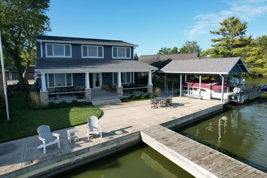Stunning open water escape on Indian Lake featuring a custom built 3-bedroom home with 3.5 baths, 2 car attached garage, steel framed covered boat dock with lift, fishing dock, poured concrete sea wall, massive concrete patio, large scenic porch, & all with a fantastic view of the lake! Home features custom cabinetry & trim, owner's suite, visitor's suite, open floor plan for entertaining, amazing kitchen with a large island, quality light fixtures, spacious bedrooms all with lakeside views, additional living space on the 2nd floor, ample storage, whole house generator, & Hardie board fiber siding on the exterior!