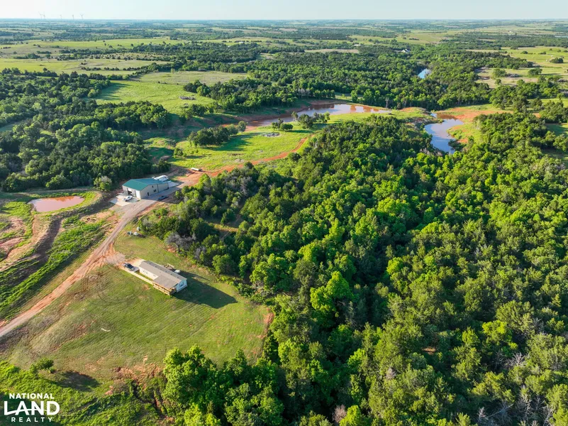 Situated just north of Guthrie and east of Crescent, this 160 acre property in Logan County offers an exceptional blend of natural beauty, recreational opportunity, and historical significance. Located north of the Cimarron River, the land features a diverse mix of mature timber, native grassland, and seven scenic ponds totaling approximately 9 acres of surface water. Five natural springs feed the ponds, providing year-round water flow.