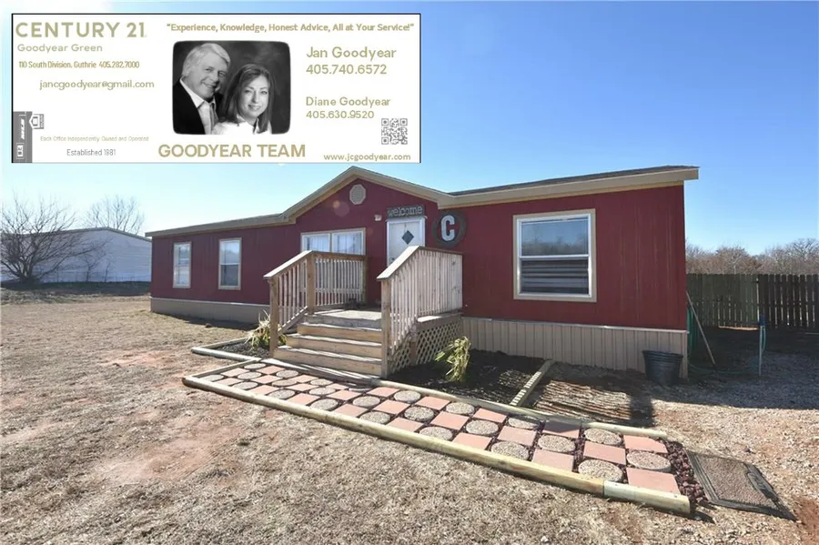 A 2012 Legacy model that was purchased in August of 2013. It measures 56' X 32'. There are two lots with this sale and the home and all improvements are on the south lot. It is total electric with well and septic systems in place. There is also a small shed in back yard and the home is in great condition and this is ready to move into. The floor plan is very open with the living-dining-kitchen all within the middle of the home with utility area master to one side and the other three bedrooms at the south end of the home. Very close access to I-35 and near the newly built Guthrie grade school.