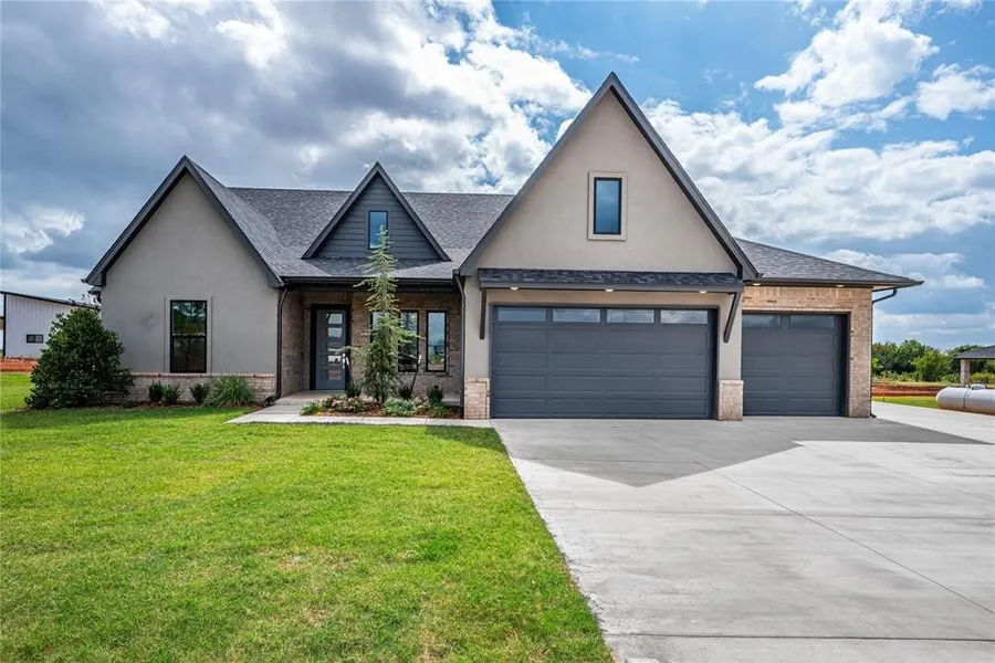 Seller is offering up to $10k towards upgrades or closing costs, PLUS preferred lender credit of an ADDITIONAL $5K toward closing costs or rate buy down, total of $15,000!! Fall in love with this gorgeous New Construction Parsons and Company home on 1 acre that offers room to breathe! The living room with wood floors is the perfect place to gather around the fireplace with an amazing textured tile that extends to the 14' vaulted ceiling. The open kitchen showcases stunning quartz counters and a modern backsplash, double oven, 5 burner gas cooktop and microwave drawer. Room for all your essentials and countertop appliances in the butler's pantry. The primary suite has direct access to the patio making it easy to let the dog out. The textured tiled wall behind the freestanding tub evokes relaxation, and you'll appreciate the massive shower daily. Tremendous storage in the primary closet with direct access to the laundry room. A large mud bench is the perfect drop zone when coming and going. The dedicated study is light and bright, with built in cabinetry and floating shelves. The two secondary bedrooms are spacious and share a bath with separate vanities. Fantastic light in the 13x18 flex room makes it the ideal space for your hobbies, a second living area, or kids play room. Over 500 sf of patios so you can enjoy the outdoors. Professional landscaping, irrigation system, water well, ATT fiber. Shop buildings and chickens allowed. One mile from Hwy 74 and Hwy 33 on all paved roads for easy access to Edmond or Guthrie.