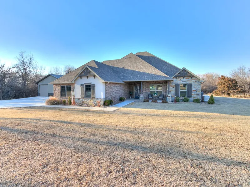 Unique is what describes this beautiful home on acreage! It’s not characteristic to live in a beautiful neighborhood and have the luxury of not only having an empty lot next you for some space, but also owning an adjoining 40 acres to completely enjoy the outdoors! Situated just inside Logan County in Deer Creek school district. A short drive to Edmond and OKC, but far enough out to enjoy the feeling of getting out of town and enjoying the outdoors. This property completely embodies the future owner that needs to be close to town, but has the desire to be able to go out their back door and be steps away from sitting in their tree stand in the fall, fishing Chisholm Creek, or exploring the woods for morel mushrooms in the spring. Completed in 2020 this home has value that exceeds an owners expectations. This home is a 4 bed, 2.5 bath, 3 car garage, attached RV garage, and a 30x40 fully in...