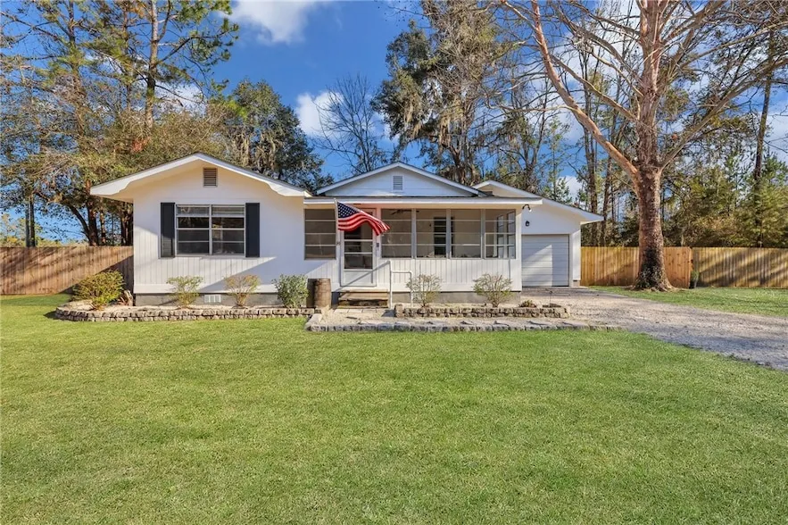 Nestled among beautiful oak trees in Ludowici, this adorable 3-bedroom, 2-bath cottage sits on 1.25 acres, offering the perfect blend of small-town charm and modern convenience. With a spacious living and dining area, this 1,244 sq. ft. home is filled with warmth and character. Enjoy your morning coffee in the inviting sunroom, where natural light pours in and offers a serene view of the property. A versatile bonus space at the back of the home provides the perfect spot for a home office, craft room, or personal retreat tailored to fit your lifestyle. For those with a love for outdoor living, this property truly shines! A dedicated chicken coop is already in place, making it ideal for anyone looking to start a small hobby farm. The second bathroom and laundry room conveniently sit just off the one-car garage, adding to the home s functionality. Recent updates include a roof and hot water heater less than 5 years old, plus a freshly painted exterior, giving this home a bright and welcoming feel. Located just minutes from Hinesville s amenities, yet tucked away in a peaceful setting, this property is the best of both worlds. Don t miss the opportunity to make this charming countryside retreat your own schedule your showing today!