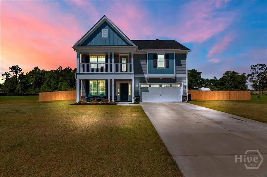 Welcome to this beautiful 4 bedroom, 2.5 bathroom home in the desirable Palmer Place subdivision in Ludowici. The main level features a formal dining room with coffered ceiling, leading to a butler’s pantry and a kitchen with stainless steel appliances, island, and ample counter space. The kitchen opens to a spacious living room—perfect for entertaining. A half bathroom is also located on the main floor. Upstairs, the primary suite includes a bathroom with double vanity, garden tub, separate shower, and a dual-sided walk-in closet. Three additional bedrooms and a second full bathroom are also upstairs, along with a charming second-floor balcony. Outside, enjoy 1.28 acres with a partially privacy fenced backyard, swing set, and two storage sheds. This home offers the perfect blend of comfort, space, and functionality. Don’t miss the opportunity to make it yours! Rear adjoining property is protected wetlands. Disclaimer: the night time photo is an altered digitally enhanced photo.