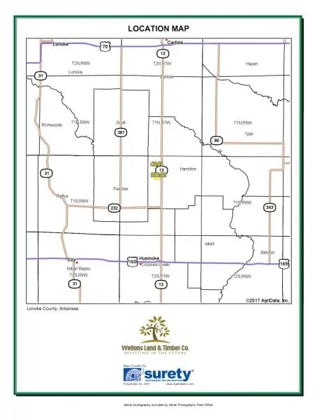 This is a rare opportunity to acquire a proven duck hunting property that offers both an agricultural and recreational investment. This premium property is located right off of HWY 13 south between Carlisle and Humnoke and is positioned right in the heart one of the best flyways in Arkansas. This area is well-known for excellent duck hunting and this farm is one of several established and proven hunting properties in the immediate area. The Funny Farm Venture property is developed with improved levees that assist in artificially flooding the woods and agricultural fields. Access to the property is thru a private gate from Daniels Road a county maintained gravel road off of HWY 13.
