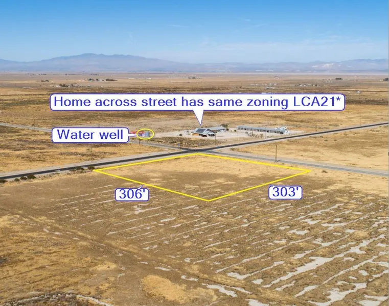 No HOA, 2.13 acre corner lot with power to the property in a desirable location with legal access on the corner of two paved roads with a total paved street frontage of 600 FT just 2 miles outside the city of Lancaster. This land has favorable LCA21* zoning allowing for a manufactured home PLUS a second home for generational family or rental opportunities. Farming and animals are allowed including the raising, care and upkeep of horses, chickens, goats and pigs. This property, like many of the farms and homes in the area, is in flood zone A and as a result, has some of the richest farmland in the high desert region.