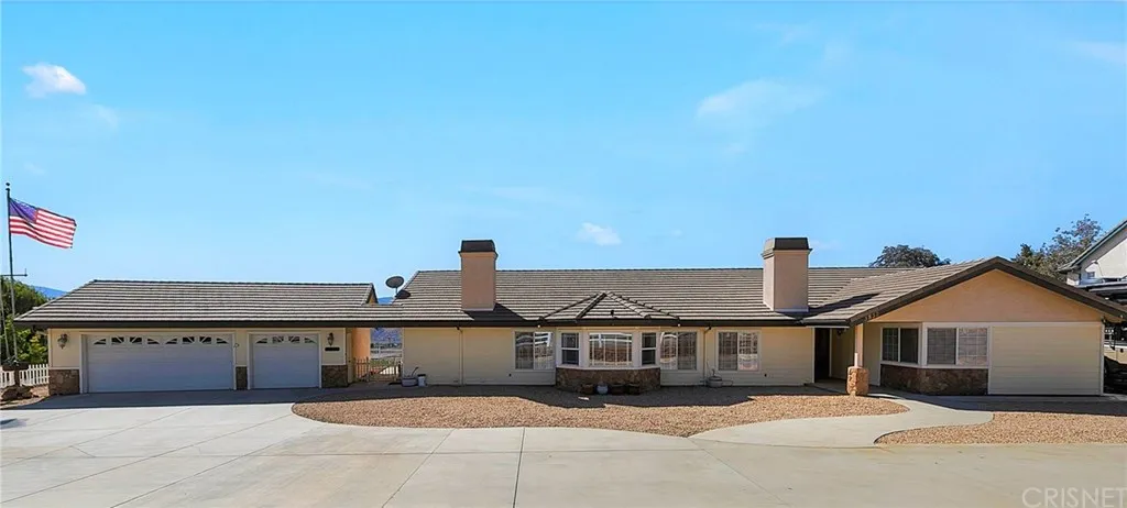 **CLEAN, single story, ranch style house on 2.3 well groomed acres! Beautiful views of the San Gabriel mountains, solar, and a white picket fence. ** RV parking with 50-foot shaded space and hookups (50 and 30 amp), plus large circular turnaround area. Plenty of usable land for hobbies and toys ** 3 bedrooms, 3 bathrooms, plus office/optional 4th bedroom and a permitted SUN/bonus room! Dual-pane windows provide bright natural light. Open floor plan- spacious kitchen/eating area/great room with high ceilings. Master bedroom nicely sized with two closets, and master bath with all the amenities. Vinyl corral fencing with wire mesh surrounds entire property to keep your pets in, and others out. Low voltage LED outdoor lighting, block retaining wall, extensive concrete, and artificial turf = low maintenance. Electric gated entry, detached 3-car garage with built-in cabinets, covered breezeway...
