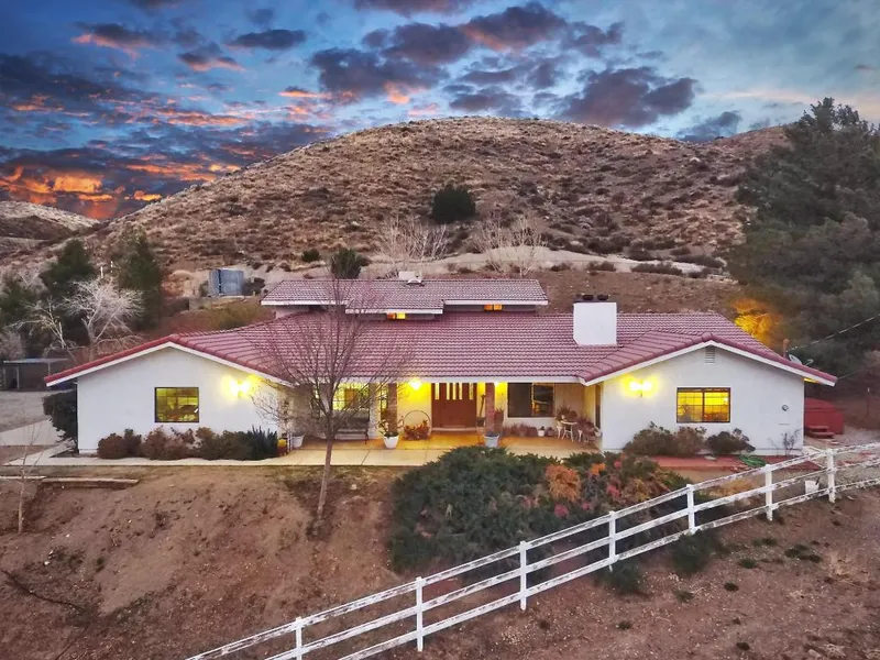 Lovely Leona Valley Home on 15ac! View VIDEO TOUR. Private, gorgeous views yet minutes to Palmdale & Quartz Hill. Custom home with 3 bedrooms plus an office/bonus room, 3 baths. Rich wood work including open beam ceilings. Formal living & dining plus family room with cozy floor to ceiling brick fireplace. Great kitchen with center island, lots of cabinets, pantry, nook, bill desk & nook looking out to patio. Master w/ fireplace downstairs! Walkin plus second closet. Large master bath w/ 2 sinks, 2 shower areas. Secondary bedrooms upstairs w/ balcony access of each. Covered patio, spa, builtin BBQ. New HVAC, water heater, Anderson door to patio. 2 stall barn, 2 pipe corrals w/ shaders, office trailer. Ready for animals or just private open space. Rancho Colinga Water group. Amazing views!