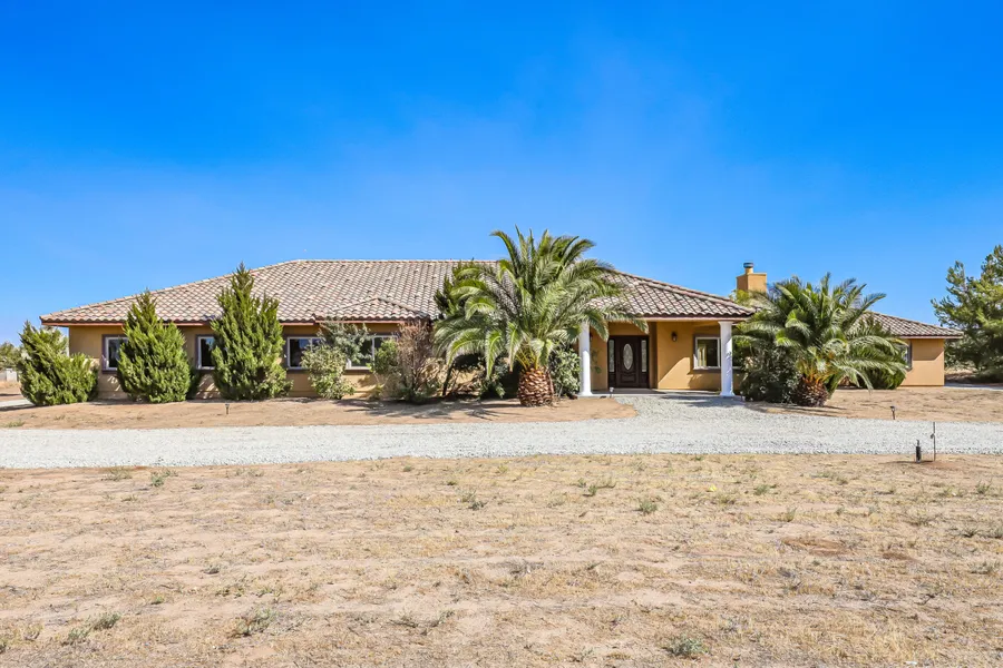 Custom Single Story 4315sf Beauty on 2.87 acres in West Palmdale. Contemporary Open Floor plan. Formal Living w/ Cozy Fireplace & Dining Rooms great for entertaining. Huge Family Room w/ French Doors to patio is adjacent to Kitchen. This is a Dream Kitchen! Huge Center Island. Custom Cabinets. Lots of Counter Space. Stainless Appliances including Double Ovens & Wine Cooler. Walkin Pantry. Breakfast Bar and Large Nook looking out to back. Huge Master Retreat with Office or Nursery. Massive Walkin Closet. Luxurious Master Bath--Dual Vanity Sinks, Spa Tub, Separate Shower. All other bedrooms also large. All baths have custom finish including vanity style sinks/granite. Large Laundry Room. Two tone paint with wide baseboards thruout. Rough Cut Travertine Flooring. Lots of Ceiling Fans. Under Roof Covered Patio. Grass and Trees. Four Car Finished Garage.