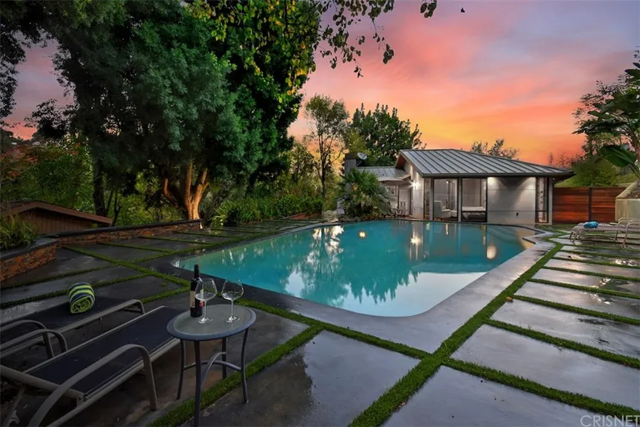 Behind a privacy gate, this Custom Contemporary home sits on more than an acre with mountain and city light views. The attention to detail is awesome. A meandering walkway takes you over a pond to the front door and into this enticing modern design with polished concrete floors, vaulted beam ceilings, and walls of glass. The chef's kitchen boasts Brazilian Rosewood cabinets, stainless steel appliances, a Miele convection oven/microwave, and a huge pantry w/utility sink. The formal dining room has a Miele coffee station and wine fridge adjacent is the great room and a sitting area with a floor-to-ceiling onyx fireplace glass doors to the pool and views of the city lights beyond. The great room has pocket doors to bring the outside in. Step outside to a gracious pebbled oak treed-patio. The main suite with dramatic ceiling, views of the lush greenery and pool has ample closets, spa like ba...