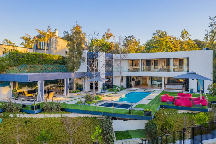 Gated and private, this striking two-level Hollywood Hills view home features 3 BD, 5 BA, and over 4,500 sq. ft. of light-filled refined living space. Indulge in transcendent jet-liner views, prominently located on over an acre of flat land, offers unobstructed dazzling city & mountain views. Inside, the sweeping layout offers lavish stone tile floors, 21ft floor-to-ceiling windows, & retractable glass walls creatating seamless indoor-outdoor living throughout. The first level offers multiple living spaces, complete w/ a formal living room w/ fireplace, family room w/ fireplace, stone tile floors, custom gourmet chefs' kitchen w/ high-end Woolf fixtures & appliances, built-in bar, adjacent dining room, breakfast bar & powder room. The second level offers a stunning expansive master suite w/ en-suite bath complete oversized shower, dual sinks, an extensive custom walk-in closet, & outdoor...
