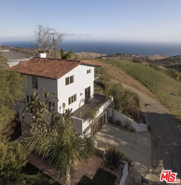 Stunning ocean views from this beautiful Spanish home set in the Malibu Mountains. The home is ideally set allowing both a flat grass front yard taking you up to the front door and an expansive grass backyard with wrap around deck taking full advantage of the corner lots views of both Mountain and Ocean views. The main level open floor plan allows for easy flow between the living, dining and kitchen, which is slightly tucked away allowing enough privacy while still being connected. The main level also has a bonus room that can easily be used for a 4th bedroom or an additional living space as it opens up into the living room. Upstairs includes 2 bedrooms with a Jack & Jill bathroom and the master suite with high pitched ceilings, beautiful ocean views from the bedroom & deck and bathroom with separate bathtub and shower. The property also features a nearly 1,300 sq. ft. garage underneath the home where you could easily have a 2 car garage and separate studio with windows looking out and doorway to front patio already in place. This charming Spanish home is a hidden gem in the Malibu Mountains and won't last long.