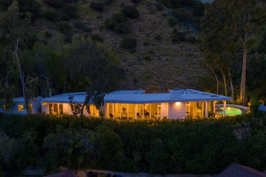 Set above a gated drive and private from the street, lies this Mid-Century Modern with stunning city views. Situated on over an acre of land in the highly coveted lower Doheny neighborhood. This beautifully restored single-story is moments away from endless amenities, eateries and retail, yet nonetheless very private as it is set up above a secluded cul-de-sac and is enveloped by lush hillsides. Upon entering, floor to ceiling walls of glass reveal city views & pool. The home renovation strikes the perfect balance between contemporary finishes and its classic, restrained interior of poured concrete floors, crisp white walls & retracting glass that encourages seamless indoor-outdoor living. The Chef's kitchen is perfect for entertaining, as it offers a large preparation island, opens to the rear yard and features light oak cabinetry, Carrera marble & Viking appliances. The expansive master suite features luxurious appointments, including a sitting area, fireplace, city views, luxurious bath & walk-in, custom wardrobe. There are also two additional interior suites & a separate exterior guest suite. Truly a quintessential L.A. modern home with its classic lines, simplicity & elegance.