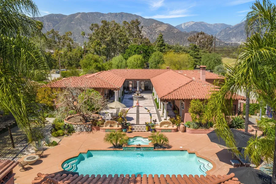 Hacienda La Encantada, a triumph of style and rarity. This dual gated, iconic architectural Mexican - Spanish style estate is one of Claremont's finest. Property includes a single level U-shaped residence, a separate guest/pool house, a main vehicular garage, plus an RV/boat garage. This one-of-a-kind property was custom built for the original owners by Mark Estupinian, a famed long-time builder well known for exceptional design and craftsmanship. Most of the features at the property were imported and custom-made in Mexico. The home is perfectly poised on the lot to best capture the panoramic views of the San Gabriel mountain foothills. Inside you will enjoy a versatile floor plan with colorful garden views at every turn. Formal foyer leads to a luxurious dining room experience boasting artistic tiles, sloping ceilings, and a handsome eye-level fireplace. The chef-designed kitchen features modern appointments and opens to the family great room which includes a dining area and refreshment center. Generous-sized bedrooms all include luxurious en suite bathrooms boasting numerous custom built-ins. The backyard is a symphony of visual dissonance and resolution. The more than one acre grounds boast functionality and privacy offering captivating desert and tropical landscaping, multiple patio settings, outdoor kitchen, a spectacular swimming pool and spa, a multi-purpose sports court, a bocce ball court, plus much more - all together makes this California homestead a mecca for outdoor entertainment. The property is peacefully nestled at the end of a cul-de-sac in a quiet, tranquil setting.