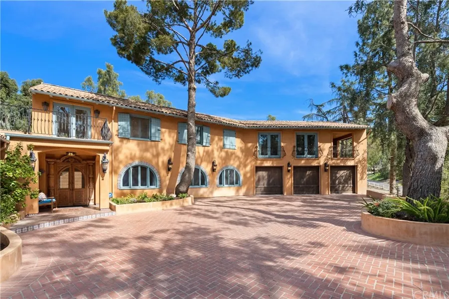 Gorgeous hillside equestrian estate with modern facilities for 10+ horses, set on nearly 3 acres, in the sought-after community of Shadow Hills. This gated property boasts views of lush landscape & rolling hillsides from every angle. It features a California style, including knotty pine floors, Spanish/Moroccan clay tiles, a beautiful Spanish front door, multiple courtyards, wrought iron details & stone fireplaces. The 5 bedroom, 4.5 bathroom home features two primary bedroom retreats. The second floor primary suite includes a spa-like bath and large closet. It also features a home theater, "smart" home capabilities, two offices, and an updated gourmet chef kitchen. Solar panels supply energy to two Tesla Powerwalls reducing energy bills. The wrap around stone terraces provide outdoor living spaces, featuring a Viking grill, built-in heaters, fountain, glass railings, sound system, all overlooking the lighted pool and tranquil backyard below. This spectacular estate also provides amenities for the Equestrian Outdoor Lifestyle - white rail fenced arenas, a 10-stall barn, a lighted arena, round pen, mature shade trees, tack room and screened area with washer hook up and hot-water sink. A storage shed and carport provides additional covered parking. This estate is conveniently located just off the Hanson Dam Riding Trails, while offers privacy, tranquility, and room to entertain.