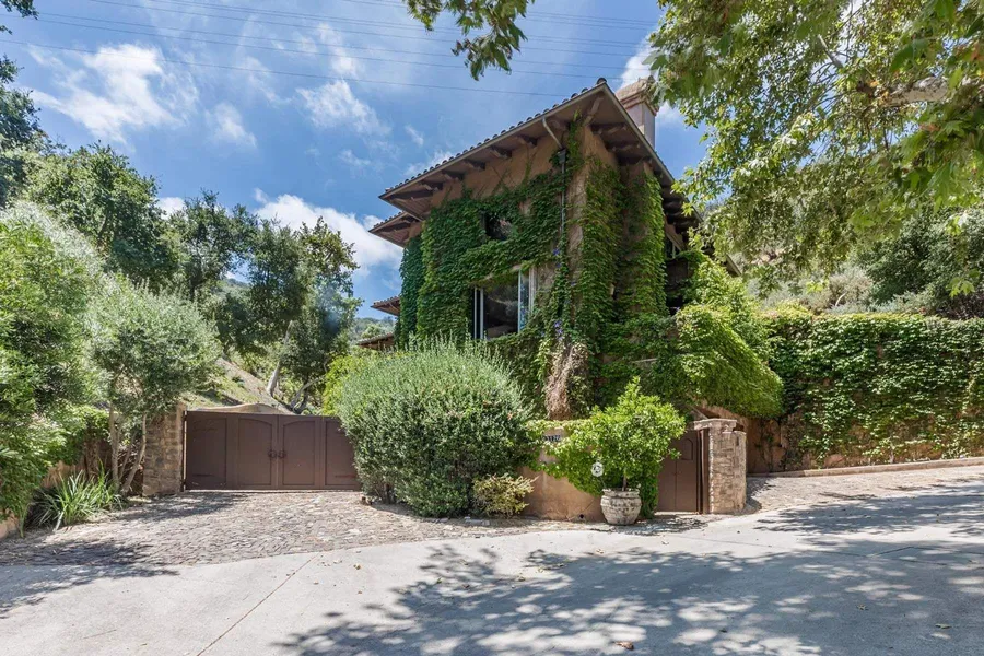 Atop the much coveted Mandeville Canyon, an enchanting estate on almost four acres, brings to mind the romantic villas of the Tuscan countryside. Old World inspiration is readily apparent in its classic barrel-tiled roofline, stately stonework, decorative ironwork, richly hued woods, lush climbing vines, Venetian plaster walls, and earthy terra cotta tile. The heart of the home is an open great room that includes a bright, inviting dining area with sturdy ceiling beams, a living area with an eye-catching fireplace surrounded by built-in bookshelves, and a warm, welcoming kitchen with farmhouse sinks, distinctively detailed wood cabinetry, an oversized island, and stainless-steel appliances including a six-burner Wolf range with a griddle. The colorful billiards room boasts ceiling beams with corbels, a wall of thoughtful built-ins, and a full wet bar. Ideal for more formal moments is an elegant living room with a soaring ceiling, a floating fireplace, and large sun kissed windows. One of four bedrooms, the upstairs owner's suite features a striking pitched beamed ceiling, an expansive walk-in closet, an outdoor patio and an en suite bath with dual vanities and a spa tub tucked away in a windowed corner. Other highlights include an office with double glass doors, a discreet gym with a mirrored wall, and a 200 bottle walk-in wine cellar crafted of stone and wood. Nearly every room on the main level of the residence opens up to the magical grounds. Enjoy alfresco festivities on the cool and breezy covered patio that includes an outdoor kitchen rich with organic hues boasting a built-in stainless-steel grill, a single tap kegerator, and a pizza oven with tile accents. Steps away is an open-air patio flooded with sunlight and a refreshing swimming pool & spa enveloped by dramatic stonework, thriving greenery, and colorful flora. Fenced expanses of manicured grounds and tall trees create the perfect setting for peaceful private wanderings, all just an 8-minute drive from Sunset Boulevard.