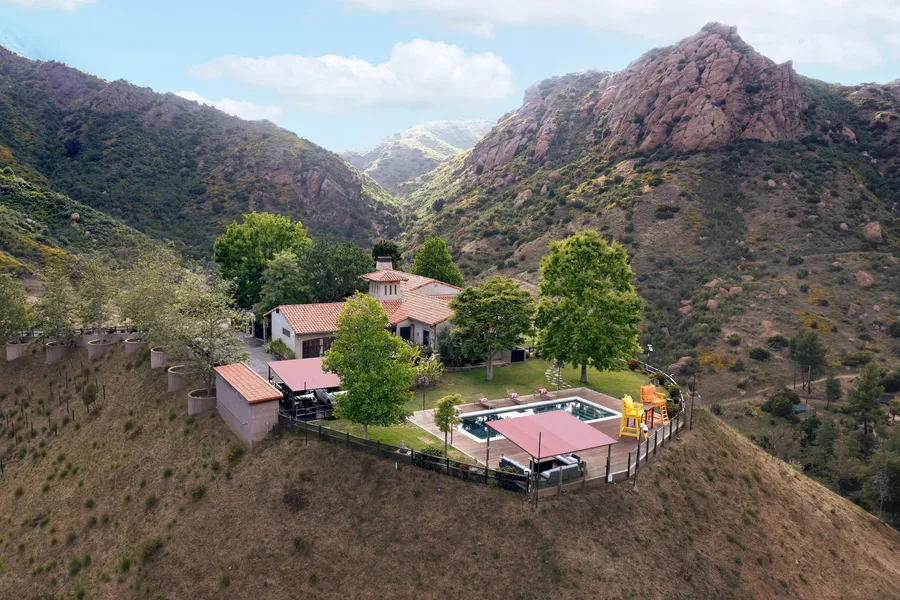 NOW AVAILABLE FOR QUICK CLOSING! Perched atop your very own mountain, this breathtaking single-story Spanish-style estate offers unparalleled 360° panoramic views. Encompassing approximately 18 acres in the serene Lobo Canyon of the Santa Monica Mountains, this property borders open space and a National Park, ensuring absolute privacy and tranquility. Enjoy spectacular, uninterrupted views of mountains and rock formations from every angle of this magnificent estate. The great room is a masterpiece with true harvested barn wood floors, exposed beams, and multiple French doors that open to the stunning surroundings. The estate includes approximately 3,700 square feet of open living space with 4 spacious bedrooms and 4 beautifully appointed bathrooms. A winding driveway leads to a gated courtyard adorned with custom tiles, setting the tone for the bespoke touches that abound throughout the property. Perfect for entertaining, the property boasts a pool with views, additional pads for a barn, potential vineyards or orchards, and ample space for solar panels. Recent improvements include triple-pane windows, a new septic system, WiFi connectivity, and a comprehensive multiple-camera security system. This trophy property is ideal for the discerning buyer seeking a private retreat with epic views and luxury. Whether you choose to make it your weekend getaway or primary residence, this unique property offers endless possibilities for enjoyment and relaxation. Don't miss this rare opportunity to own a piece of paradise in the Santa Monica Mountains. Escape the city and schedule your private tour today!