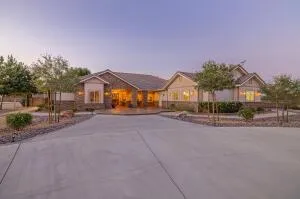 Welcome to your new custom ranch home. Perfectly situated on a corner lot with a beautiful view of the the valley desert. The entire property is contained within block and wrought iron wall with motorized security gates. The courtyard sets the tone with its beautifully manicured landscaping and custom lighting. Step inside to discover stunning stamped and stained concrete floors vaulted and stepped ceilings with custom lighting and built-in audio speakers. Great room with brick fireplace. Extra large family/game room, with built-in wet bar, free standing pellet stove, and refrigerator. Granite countertops, travertine tile, custom cabinetry, and shutters are just a few of the many extras. 1900 sq. ft out building with RV storage and 3 car garage, RV hookup with dump station, underground grass watering system in backyard, automatic fertilizing system for grass and plants. backyard built-in grill, sink, refrigerator and entertainment patio with wired TV. Large laundry room with network closet for servers and devices, whole home audio with built-in speakers. This property has it all.