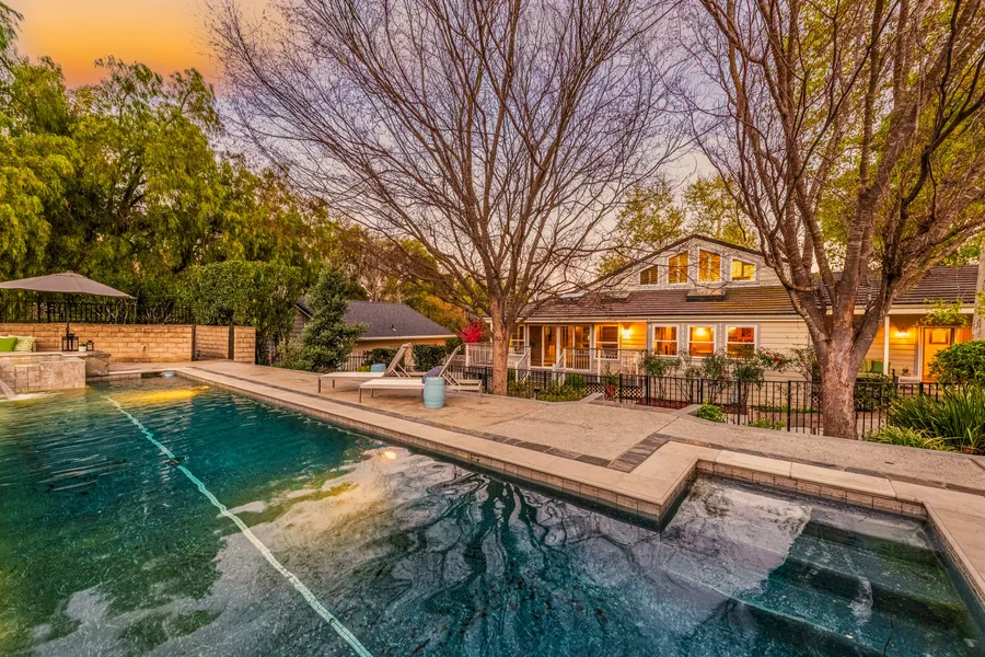Imagine stepping into a simpler, more peaceful way of life, surrounded by nature's beauty and the warmth of a traditional Craftsman home. Situated in the picturesque neighborhood of Old Agoura, this enchanting property offers the perfect blend of rural tranquility and modern convenience. It's a haven for those who yearn to live off the land, with its lush gardens, fruit trees, and expansive outdoor spaces. The main house features a spacious Great Room with peaked wood ceilings, a rustic, stone fireplace and large picture windows that flood the space with natural light. The turn-of-the century styled kitchen is rich with soapstone counters, custom cabinetry, Schoolhouse lighting and a built-in coffee hutch, evoking a sense of nostalgia and warmth. The main house floorplan features a first-floor primary suite with peaked ceiling, private porch and large bathroom. The 2nd bedroom w/ensuite bath and separate powder room are also conveniently on the main floor. A serene retreat on the second level is all by itself and is perfect as a second primary suite, studio or guest quarters. The guest house offers a kitchen/living room area and separate bedroom and bathroom. The property has a large, circular driveway with gates on both ends and there's an easement on the neighbor's driveway , leading to a 3rd gate, affording easy access to a huge flat area at the rear of this parcel. As you wander through the property, you'll see how well designed the lot is. The pool, spa, firepit and outdoor dining area is a peaceful haven perfectly positioned near the main residence while the guest house enjoys its own secluded spot. As you meander along you'll be surrounded by an abundance of fruit trees and several enclosed vegetable plots, providing fresh produce all year round. Don't miss the oversized chicken coop, large shed, and raised garden beds on wheels! This welcoming home blends natural abundance with peace and tranquility. Located in the rural yet conveniently located neighborhood of Old Agoura, near schools, shopping, freeway and a 4000-acre national park with its many miles of hiking, cycling & horseback riding trails. And, it's only 20 minutes to the beach. Part of the acclaimed Las Virgenes School District. Main House: 3 bedrooms + 3.5 baths + detached 2-car garage. Guest House: 1 bedroom + 1 bath + kitchen/living room. 3,212 square feet is for combined main and guest house.