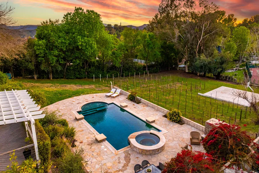 Picturesque Old Agoura is the idyllic setting for this gated, single-story property that embodies the essence of a southern European country estate. Set on a gorgeous acre of land, it offers ample outdoor spaces to indulge in the breezy California lifestyle. As you step inside, the relaxed ambience invites you to feel at home. The Great Room welcomes you with its peaked ceiling, stacked stone fireplace, warm wood floors and lovely views to the stone terrace. The kitchen is a culinary dream, blending classic modernity with rich navy cabinetry, stone counters, a spacious walk-in pantry, and stylish light fixtures. The adjacent eating area accommodates a large farmhouse table, bathed in natural light from a bank of wood windows. This versatile single-story home spans over 3,700 square feet, featuring 5 bedrooms and a charming library. One wing includes a spacious guest suite with a kitchenette, family room, bed and bathroom; it also offers a separate exterior entrance, perfect for guests or extended family. The other wing boasts a luxurious primary suite with a private deck overlooking the pool and patio, a sumptuous bathroom, and a fabulous walk-in closet. Three additional large bedrooms and a tastefully remodeled hall bath complete this wing. Don't miss the quaint library/music room down the hall! Just off the kitchen and living area lies the stone veranda that offers a bucolic vista you won't tire of. Meander down to a stone patio reminiscent of an Italian B&B complete with a classically shaped pool and spa, alfresco dining spaces and cozy fireplace - perfect for entertaining or relaxing. Exploring a little further, discover a small vineyard of Syrah and Cab vines and much land beyond that. Note, there is plenty of room for horse keeping here. Located in Old Agoura, this property is close to town, shopping and the freeway and is within the Las Virgenes School System. Close to a 4,000- acre national park with hiking, cycling and horseback riding and only 20 minutes to Malibu. This rare gem combines rural charm with modern convenience, making it ideal for those seeking a peaceful retreat with easy access to urban amenities.