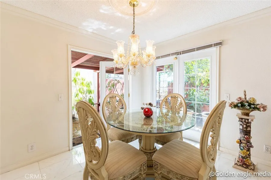 Welcome to 11465 Fox Hollow Lane, a VA Loan Approved Property—a meticulously cared for residence nestled in the desirable California Glen gated with a 24-hour guarded community. This 3-bedroom, 2.5-bath home boasts 1,926 square feet of luxurious living space, offering a refined blend of elegance, comfort, and functionality. You’ll be captivated by its curb appeal and lush trees—all set in a quiet, family-friendly cul-de-sac. Step through the front door and be greeted by sunlight-drenched interiors and Calcutta marble flooring that runs throughout the formal living and dining areas, creating a bright, airy, and opulent atmosphere. The formal living room is adorned with designer mirrors, crown molding, and a white brick fireplace. Just beyond, the dining area showcases a custom Chandelier and two French doors that lead to your private backyard oasis. Back inside, the kitchen is warm and cheerful, featuring white cabinetry, tile countertops, and a large garden window that brings in plenty of natural light. Equipped with a stove, built-in microwave, and ample pantry storage, this kitchen is ideal for the home chef who loves to cook and entertain: a convenient breakfast bar and adjacent dining nook offer casual dining options for busy mornings or intimate evenings. The family room is designed for comfort and entertainment, featuring plush leather seating, built-in cabinetry, and a wet bar with rich, deep mahogany tones and classic, carved detailing on the front panels, showcasing artisan craftsmanship and a vintage appeal. A striking curved staircase with rich wood handrails and classic white balusters, and a grand chandelier that leads upstairs.