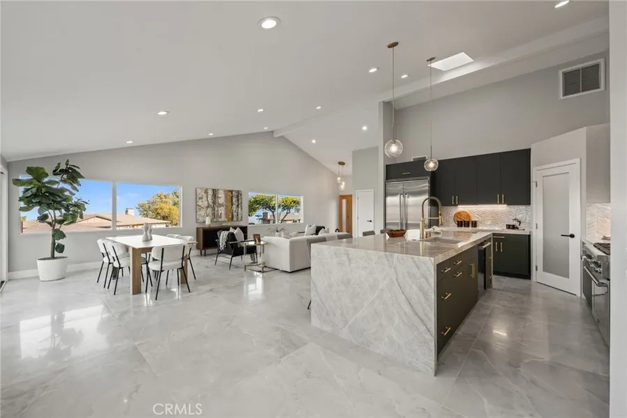 Step inside to soaring vaulted ceilings, sun-filled open living spaces, and a designer chef’s kitchen with a massive center island, oyster-shell ceramic backsplash, custom cabinetry, and premium stainless appliances. Natural light highlights the white-oak engineered floors, porcelain tile accents, and the stunning marble feature wall in the spa-inspired primary ensuite.