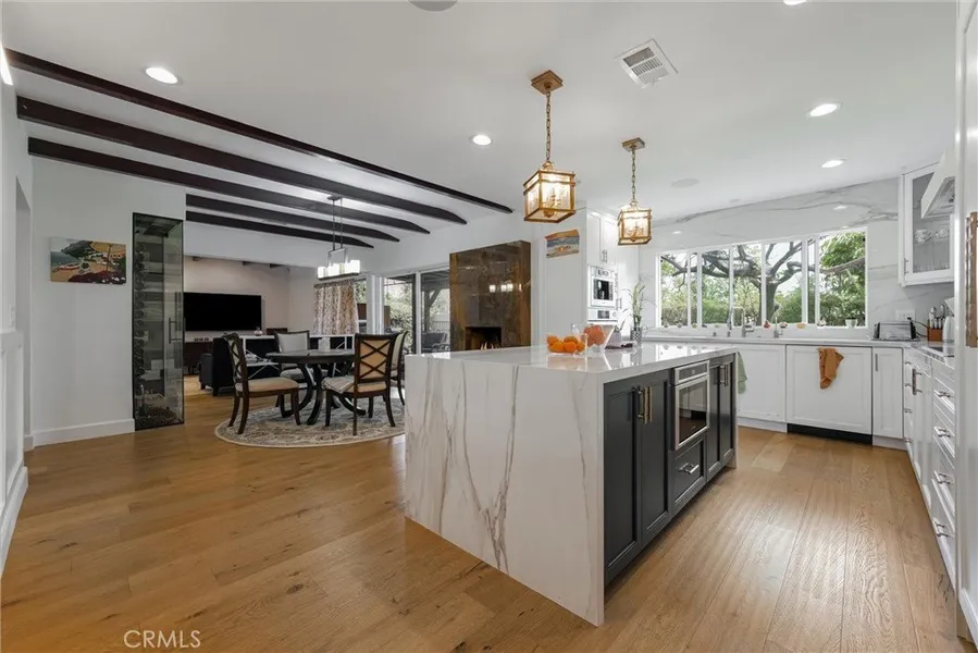 Step inside to a bright, welcoming foyer that flows into a spacious living room with a cozy fireplace—an ideal spot to relax and unwind. The formal dining room, also with its own fireplace, connects seamlessly to the beautifully designed chef’s kitchen, which showcases quartz countertops, custom cabinetry, and premium Bosch appliances including a stove, oven, microwave, dishwasher, refrigerator, and built-in coffee machine. Hardwood floors, custom woodwork, and exposed beam ceilings give this home its unique warmth and charm.