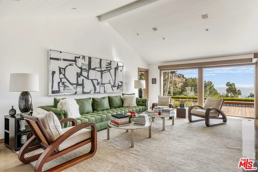 A private oasis in the Bird Streets, this fully renovated, mid-century home is the essence of California cool. With interiors designed by Peter Dunham, the updated ranch house has been published in Elle Decor. After entering the gracious foyer, you are mesmerized by the expansive view from every room. The primary bedroom, living room, family room, dining room, and kitchen all access a recently renovated wood deck and saltwater/mineral pool which evoke a hotel in St Barths. A smart Control 4 system, a standing seam metal roof, Waterworks fixtures, and custom millwork throughout create a polished and updated take on mid-century style. Open to the dining area, the handsome kitchen features Viking and Subzero appliances. A sophisticated primary bedroom suite with pitched ceilings contains a generous walk-in closet and marble bathroom. A library/office tucked into an interior space create the...
