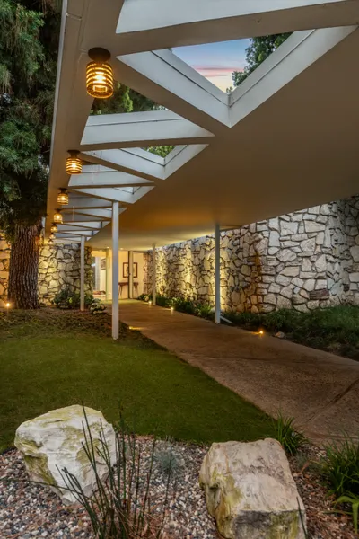 A true architectural gem by master architect A. Quincy Jones, AIA, this mid-century masterpiece is nestled in the heart of Beverly Hills on a rare street-to-street 1.2-acre lot north of Sunset. Exemplifying timeless California modernism, the home showcases original mid-century details including iconic floor-to-ceiling glass walls that flood the interiors with natural light, terrazzo flooring, fieldstone accent walls, and a classic step-down bar. The open-concept layout seamlessly connects expansive living and dining spaces to multiple patios and outdoor spaces, ideal for effortless indoor-outdoor living. The primary suite offers a serene retreat with a cozy fireplace, dedicated relaxation lounge, and a spa-inspired bath, all opening to a lush, park-like backyard complete with a swimmer's pool and N/S tennis court. A thoughtfully designed two-unit guest house complements the original arch...