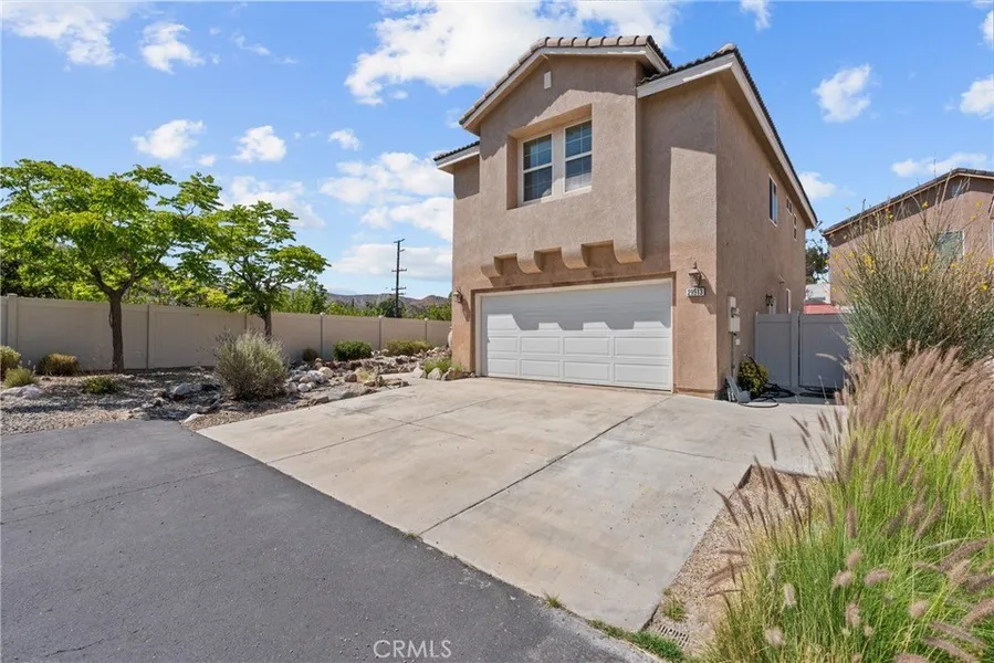 Wonderful former model home located at the end of a peaceful cul-de-sac in the desirable Mint Canyon community with one of the best locations in the neighborhood! This beautiful two-story home features 4 spacious bedrooms and 2.5 bathrooms. Inside, you'll find a light and open floor plan that is freshly painted with neutral tile flooring throughout the downstairs and carpet upstairs. The formal living room features a cozy fireplace and a built-in media center, while the adjacent dining area provides the perfect space for entertaining. The kitchen is both functional and stylish, boasting sleek granite countertops, an ample center island, breakfast bar, recessed lighting, large pantry with double doors, a double oven, built-in microwave, cooktop, and refrigerator. A charming dining nook with a stylish designer light fixture and French glass doors leads directly to the large backyard where you’ll enjoy stunning mountain views, an enchanting cobblestone patio area, built-in planters, a serene pond, BBQ area, and a private above ground spa - perfect for playing with a pup, relaxing, or hosting your friends and family. Upstairs, the loft area features a built-in office nook perfect for working from home or doing homework, and the laundry room offers added convenience. The primary suite is a true retreat with dual walk-in closets, a spa-style bathroom complete with an oversized jetted tub, dual sinks, separate shower, and a private toilet room. Additional upgrades include a surround sound system, pre-wired alarm system, ceiling fans, huge additional storage space beneath the stairway, and durable vinyl fencing. With a low HOA, no Mello-Roos, direct two-car garage access, and a prime location perfect for locals and commuters alike just minutes from the 14 Freeway, shopping, schools, parks, and the College of the Canyons, Canyon Country campus less than a mile away, this home offers both comfort and convenience in every way!