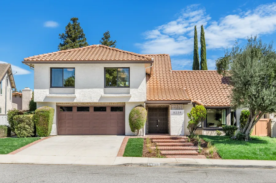 Completely renovated two-story home in the prestigious Morrison Ranch Estates, located on a quiet cul-de-sac in Agoura Hills. This elegant home features warm oak-toned flooring throughout, with a family room that boasts vaulted ceilings, a classic picture window, and a cozy fireplace. A separate dining room connects to the family room, creating a seamless flow for entertaining. Designed with both elegance and function in mind, the kitchen includes white oak cabinetry, creamy stone countertops, an arched range hood with hidden niches, all-new appliances, and gold finishes throughout. The living room makes a statement with black accents, a sleek fireplace, and a built-in dry bar with beverage fridge. A central atrium and a convenient half bathroom complete the main level. Upstairs, your oversized primary suite boasts dual closets and a tranquil, thoughtfully designed bathroom, complete wit...