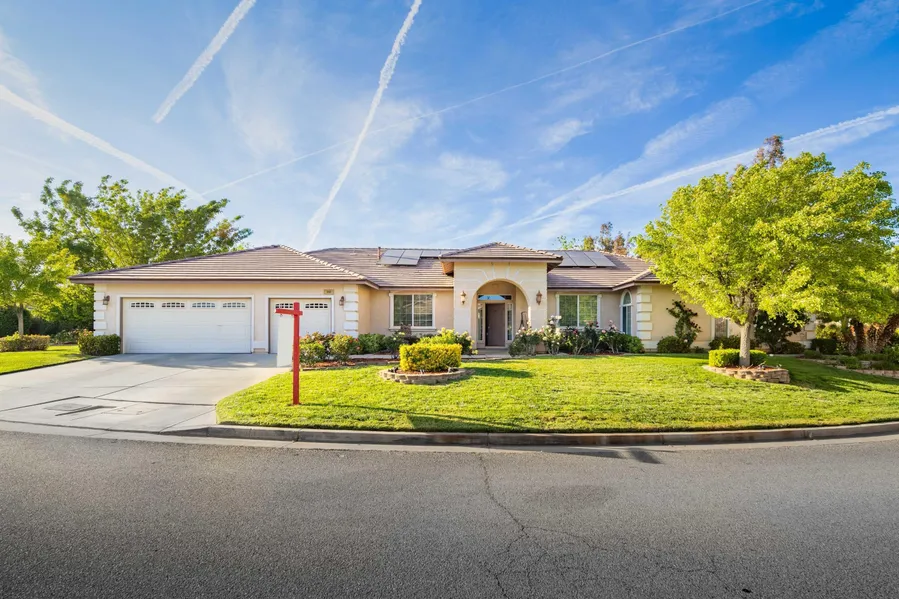 HUGE PRICE IMPROVEMENT!!! Welcome to this stunning single-story home with PAID SOLAR in the prestigious AV Fairway Estates of West Palmdale, just steps from the 7th hole of the Antelope Valley Country Club golf course. Nestled on a quiet cul-de-sac, this impressive property offers over 3,000 sq. ft. of beautifully updated living space on a sprawling 16,403 sq. ft. lot. The open floor plan features soaring cathedral ceilings, a spacious family room with cozy fireplace, formal living room, and elegant dining area. The gourmet kitchen shines with black granite countertops, upgraded appliances including double ovens and NEW gas range, NEW dishwasher and a sunny breakfast nook. This thoughtfully designed home offers 4 bedrooms and 3 baths, including a luxurious master retreat with double-door entry, spa-like bath with Roman-style jacuzzi tub, separate shower, dual sinks, and a large walk-in closet. Secondary bedrooms are generously sized, with a convenient Jack & Jill bath. Upgrades include radiant heated tile floors, Berber carpet in bedrooms, plantation shutters, custom draperies, central heat/air, and PAID SOLAR for year-round savings. Step outside to your private backyard oasis featuring lush landscaping, rose bushes, fruit trees (apricot, cherry, plum, apple, blackberry), a full-length covered patio, and an above-ground jacuzzi under a gazebo. The 3-car garage includes a home gym area for added versatility. Located in a quiet, established neighborhood with golf course access, this home blends elegance, comfort, and functionality--truly a rare find!!