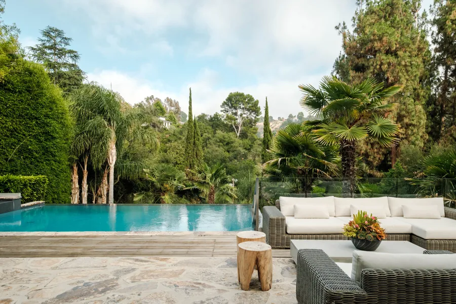 Where architecture meets altitude, this gated Beverly Hills estate is a sanctuary of modern luxury and timeless sophistication. Originally constructed by renowned architect Val Powelson, AIA, this former celebrity residence is nestled above the street in the prestigious Old Hutton Drive enclave of Benedict Canyon. Spanning nearly half an acre, the contemporary estate commands breathtaking canyon views while offering rare privacy and serenity. Designed for those who value both beauty and function, the home transitions effortlessly from moments of quiet retreat to unforgettable gatherings in grand style. The living room, crowned with soaring 14-foot ceilings, opens through expansive sliding glass doors to an entertainer's terrace with a spa, cabana, and infinity-edge pool cascading into the canyon, creating a showstopping backdrop by day or night. Just off the chef's kitchen, the family ro...