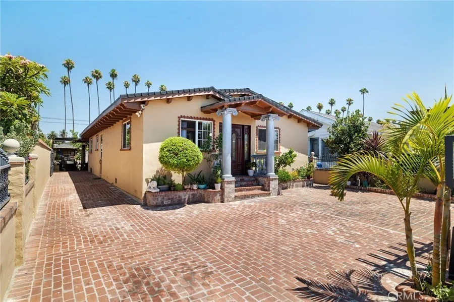 Spanish-style character meets modern upgrades at 1729 W 51st Pl, centrally located near the 10, 110, and 105 freeways. This thoughtfully renovated home features an open-concept layout with vaulted ceilings, exposed wood beams, skylights, and smooth plaster walls. The living, dining, and kitchen areas flow together seamlessly, perfect for everyday living and entertaining. Updates include new electrical wiring and main panel, copper plumbing, HVAC, insulation, drywall, and a 50-year roof installed just 10 years ago. Dual-pane windows (installed in 2020) bring in natural light, while updated LED lighting and a freshly painted exterior enhance energy efficiency and curb appeal. Original solid oak floors lie beneath the current flooring, and solid wood trim, doors, and custom touches add lasting value. The gated brick driveway and spacious backyard offer privacy and room to entertain.
