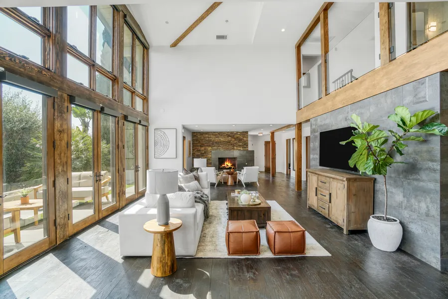 Beautiful and Stunning Custom Contemporary Ocean View home located on top of a private drive well above the street. This three bedroom, three bath with an additional first floor office that doubles as a fourth bedroom artist's home features authentic wood floors, vaulted ceilings, a spectacular open floorplan, glass second floor cat-walk, a modern solid wood kitchen with professional stainless steel Viking Pro appliances, quartz counters, double sinks, a separate utility room, a three car garage with EV NEMA 14-50 charging, central A/C, all on a usable 20,576 square ft. lot. This home was meticulously remodeled to the finest standards to create a completely usable home and yard that flow seamlessly. The great room wall of glass opens to the handsome oversized pool and fountain spillway spa, a large patio for entertaining and private terraced Lombardy deck surrounded by mature junipers. T...